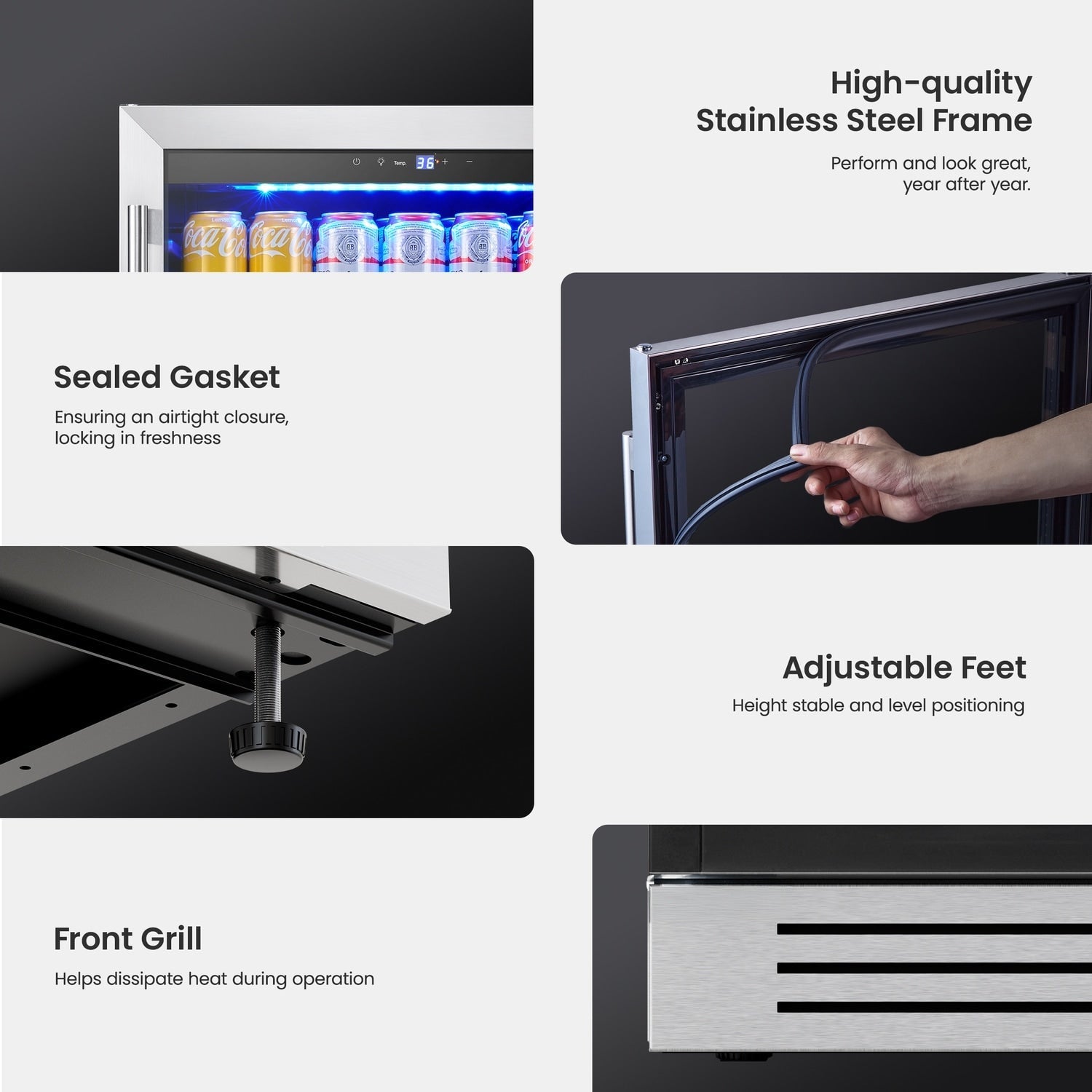 • Design élégant et sécurisé : Le réfrigérateur à boissons est doté d'une porte en acier inoxydable élégante avec une poignée en forme de L et un double vitrage résistant aux UV. Son esthétique moderne s'intègre à tous les décors.